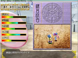 騎士選抜の本大会、前哨戦、毎月の練習試合!と3種類の戦いがあります。 画面は、主人公とイーナの戦い!主人公と戦う大会出場者は数十人! もちろんザコキャラもしゃべります!君は全員に勝てるか!! |